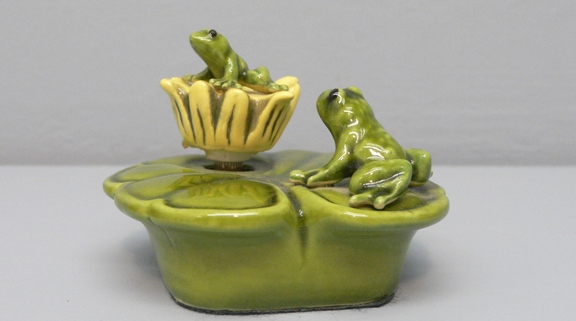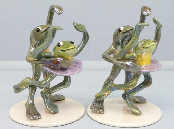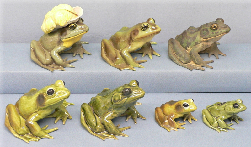 The feet and legs are positioned differently in this piece Also the mouth is open on the sitting frog, but was closed on the version that was released The frogs were separated and sold individually They are pictured below