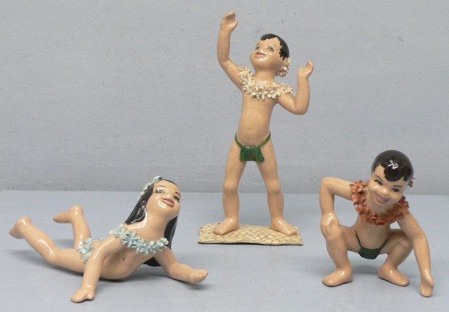 This page features Millesan Drews Keikis. These were produced by Millesan Drews, Hagen Renaker and Napco. Hagen Renaker Keikis are very, very rare. They may have been test marketed at Knott's Berry Farm in the 50's, but were never produced for sale. Very few are known to exist and all the examples I have heard about, came from factory employees.Millesan Drews made Keikis are hard to find, but not what I would consider rare. They are not as well made as the Hagen Renaker version. They are quite similar to the Napco version. The ones I've seen have slighty different colors, leis or flower placement. The Millesan Drews Keiki on base is hand signed.